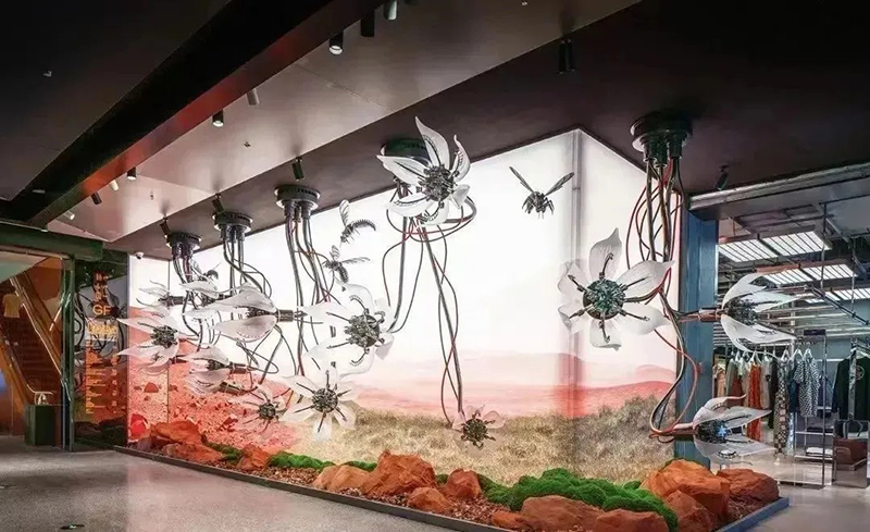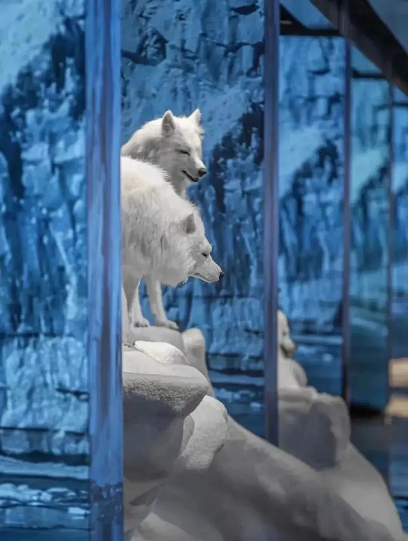 正如北京SKP-S內(nèi)的“未來農(nóng)場”以仿生羊為亮點,成都“平行世界”里猩猩漫步太空引人遐想,武漢SKP亦在負一層SKP-S精心構(gòu)建了特色主題藝術(shù)空間《EARTH 2124》。該空間巧妙劃分為三大區(qū)域:北極熊區(qū)《無邊的浮冰》,寓意著冰川的消融與生命的掙扎;走廊區(qū)《新大陸架》,象征著未來世界的重構(gòu)與探索;企鵝區(qū)《覆羽》,則是對極地生物適應(yīng)環(huán)境、重獲新生的美好愿景。整個空間緊扣“以未來之眼審視全球變暖,攜手極地生靈共繪新篇章”的深刻主題。