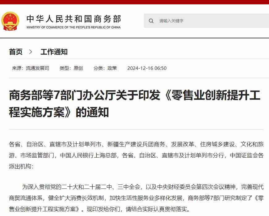 對(duì)實(shí)體商業(yè)而言,12月16日,商務(wù)部等七部門辦公廳聯(lián)合印發(fā)《零售業(yè)創(chuàng)新提升工程實(shí)施方案》(以下簡稱《方案》),旨在推動(dòng)商業(yè)場景化改造、多元化業(yè)態(tài)融合創(chuàng)新、品質(zhì)化產(chǎn)品和服務(wù)供給、數(shù)字化賦能、產(chǎn)業(yè)鏈協(xié)同降本增效。